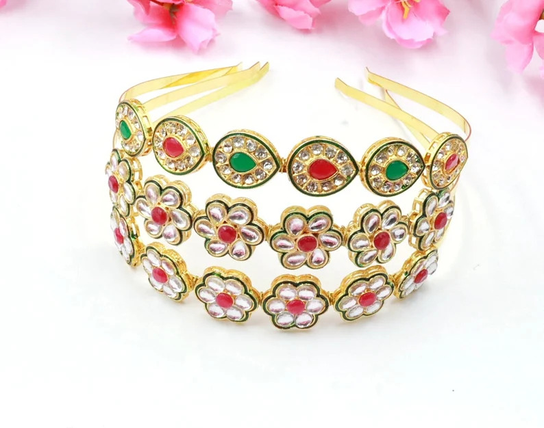 Intricate Kundan Work: Each hairband features intricate Kundan embellishments, reflecting the rich heritage of traditional Indian craftsmanship. The delicate designs and sparkling stones create a luxurious and sophisticated look.